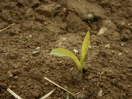 Mais: Mais-Bestände sind bereits aufgelaufen (2-3-Blatt), derzeit hell gefärbt aufgrund niedriger Temperaturen (Bild 5). Anstehende Herbizidmaßnahmen (Herbizid mit Blatt- und Boden-Wirkung) sollten erst nach Erwärmung und Regeneration der Pflanzen durchgeführt werden. Bei Mulchsaaten mit Altverunkrautung mehr Blattwirkung.