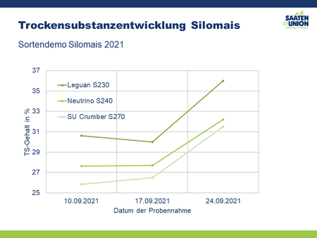 Von Anfang bis Ende September 2021 wurde aus der Demofläche in Moosburg die Trockensubstanzentwicklung unsere Silomaissorten beobachtet. In der Abbildung können Sie die Ergebnisse der mittelreifen Sorten LEGUAN und NEUTRINO sowie der spätreifensorte SU Crumber ablesen.